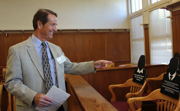 Hon. Gary Austin points to his place in the jury box.
