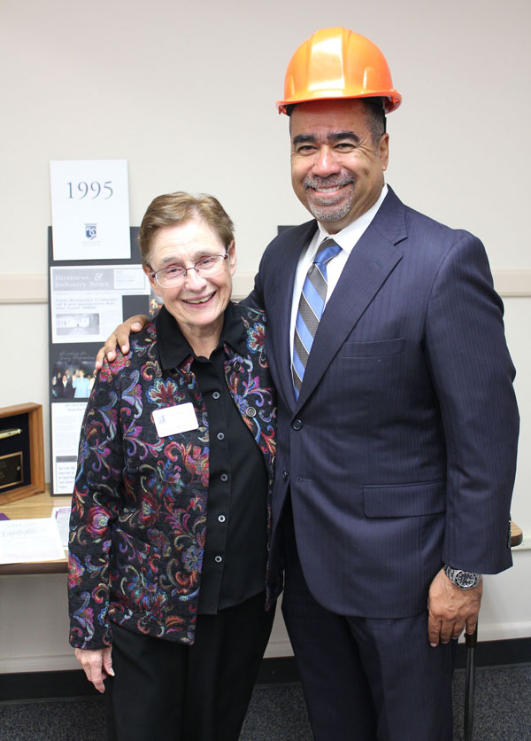 Jan Pearson and Eddie Ruiz in front of the Class of 1995 “Hard Hat Party” display.