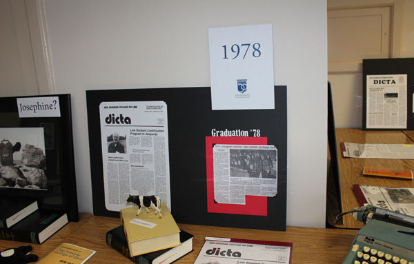 Four rooms at the Law School held pictures and memorabilia from the various classes, along with tables for those former classmates to drink, munch, reminisce and reconnect. Among the memorabilia were trophies won at moot court competitions, tassels from various years, an early computer the size of a medium microwave, a card catalogue box, a plastic cow (Is that you, Josephine?), Dicta and Inter Alia issues, a Nintendo game system from the 1980s, a hard hat, and a brick.