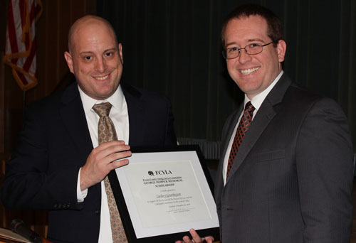 Pettit Award winner Timothy Thompson is congratulated by FCYLA President Jarad Marshall.