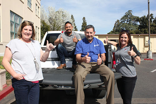 (L to R): YES Office Manager Melanie Allen, SJCL Assistant Director of Admissions Francisco Rosas, SJCL Facilities Manager Extraordinaire Rick Rodriguez, and YES Principal Kacey Gibson flash the thumbs up after some heavy book lifting!